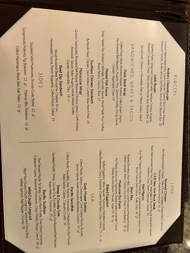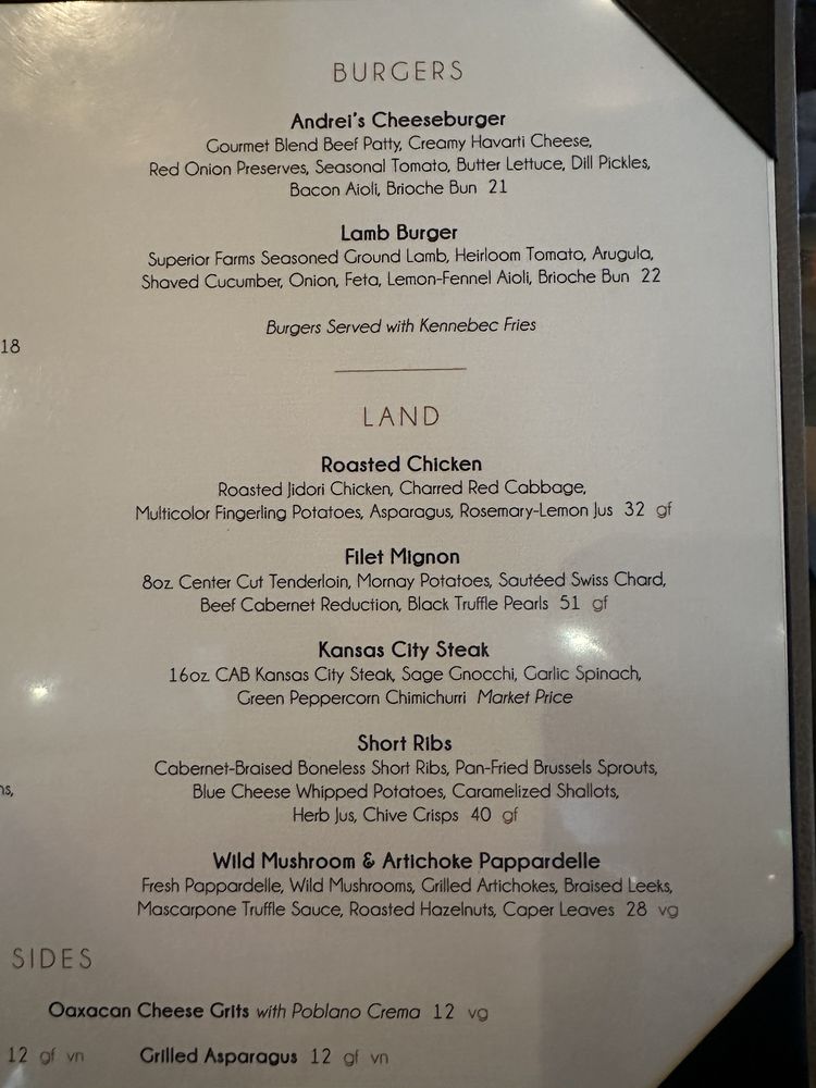 The menu highlights include the Andrei's Chop Salad featuring organic greens and roasted chicken, and the exquisite Scottish Salmon Salad, both showcasing fresh, seasonal ingredients. For burger lovers, the Andrei's Cheeseburger and the Lamb Burger are must-tries, each crafted with gourmet flair.