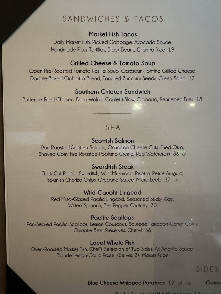 Pan-Roasted Scottish Salmon, Oaxacan Cheese Grits, Fried Okra, Shaved Corn, Fire-Roasted Poblano Crema, Red Watercress